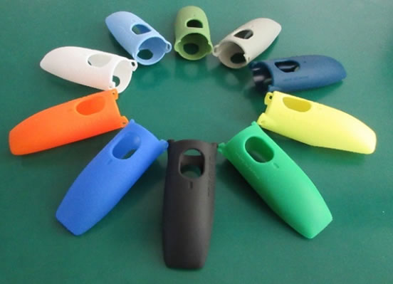 シリコーンゴムは半透明色のタイプを使用する事で、着色が自由に出来ます。その為、多くのカラーバリエーションを取り揃える事が可能です。写真は、商品化されているORCANO(自転車のヘッドライト用防眩シェード)のカラーバリエーションです。